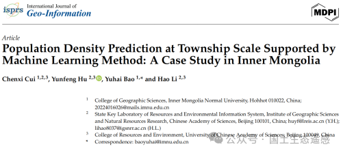 近期,中国科学院地理所胡云锋课题组、内蒙古师范大学包玉海课题组,联合在ISPRS International Journal of Geo-Information上发表研究论文:Population Density Prediction at Township Scale Supported by Machine Learning Method: A Case Study in Inner Mongolia。第一作者为崔晨曦,系内蒙古师范大学硕士研究生,中国科学院地理科学与资源研究所客座研究生。