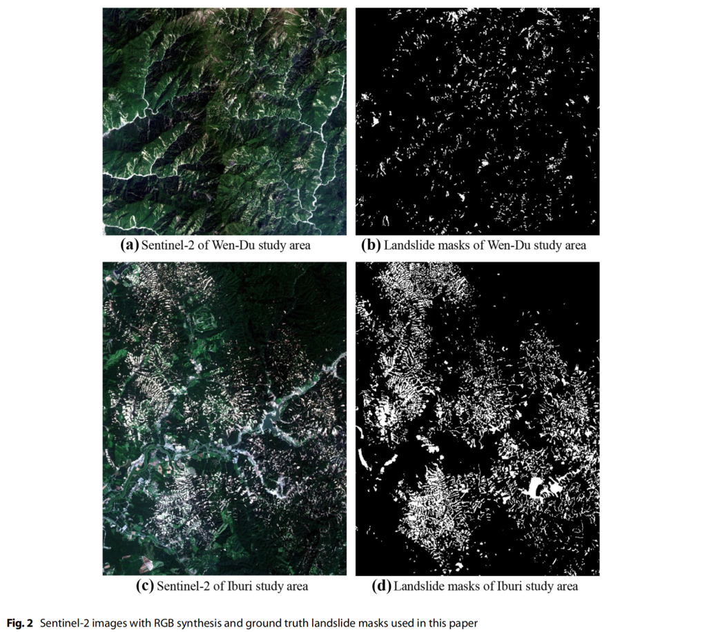 两个区域的滑坡掩膜分别由面向对象方法与已有公开数据库获取。训练样本存在明显类别不平衡。