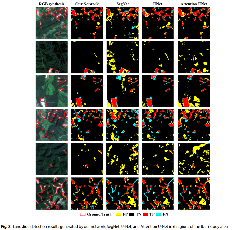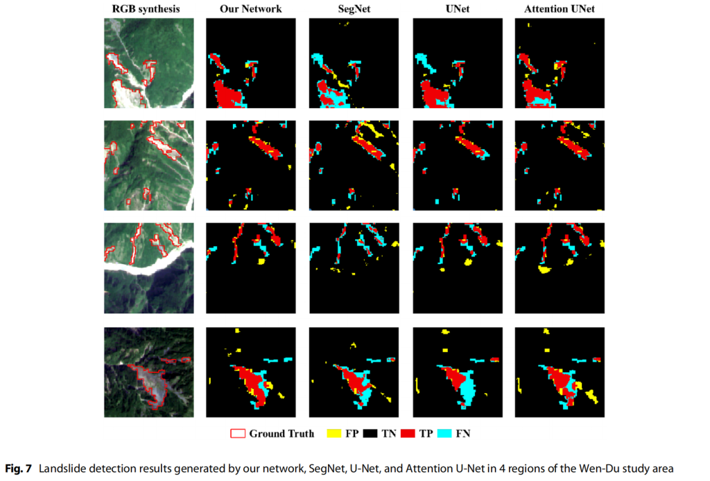 研究指出,该结果接近使用 3 m Planet 高分辨率影像的前人工作,说明中分辨率影像经适配模型后在滑坡检测上具有可行性。